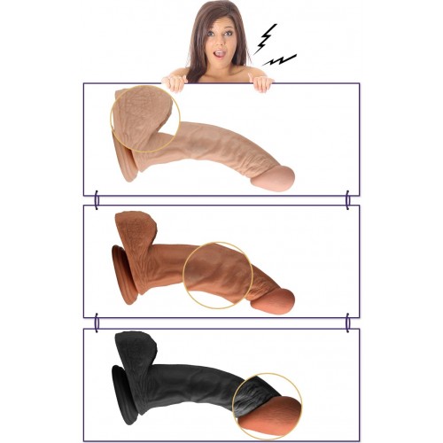 Реалистичный по форме, цвету и ощущениям, крепкий и упругий, достаточно толстый, с мошонкой и раскрытой головкой...