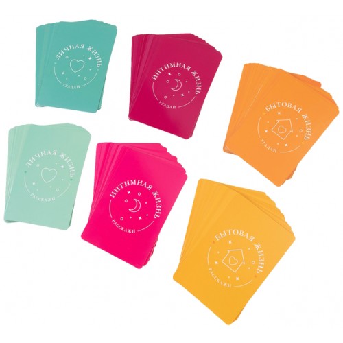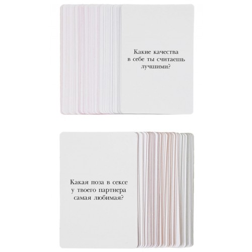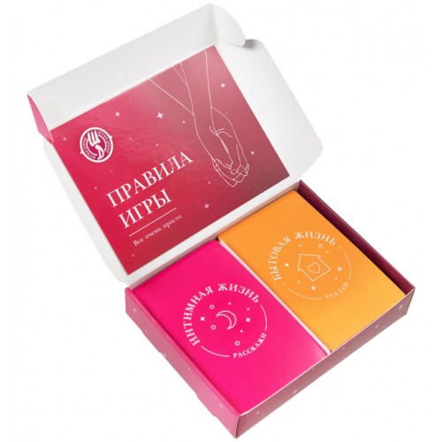 120 карт с заданиями, разбитых на две категории Расскажи и Угадай позволят раскрепоститься и довериться друг другу, ответить на самые сложные вопросы и обрести столь желанную гармонию в ваши отношениях.
