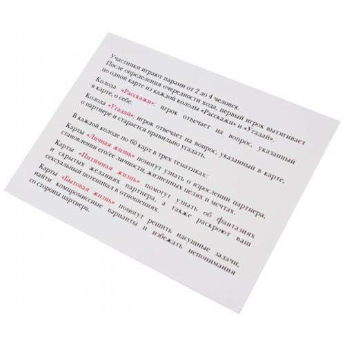 С помощью нее Вы не только приятно проведете время и повеселитесь, но и укрепите отношения в паре! Как? Обсуждая важные вопросы личной, интимной и бытовой жизни, в форме игрового диалога по душам.