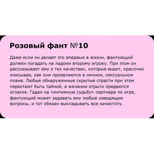 По сути, Фанты «КОФЕ-БРЭЙК» — это удобная, простая и надежная технология, позволяющая снять проблемы личностного и психологического плана в общении с противоположным полом. Все очень ЛЕГКО и ПРОСТО. Вы лишь кладете в карман или сумочку колоду с игрой и идете на тусовку или свидание. Вам не придется придумывать, как познакомиться или искать темы для разговора и преодолевать смущение, встретившись. Игра поможет вам обоим расслабиться, а затем ЛЕГКО и БЫСТРО начать общаться, чувствуя себя раскованно и непринужденно.
