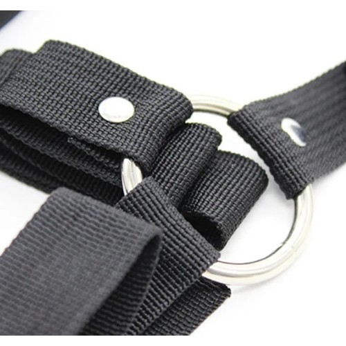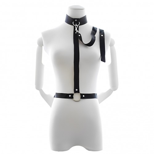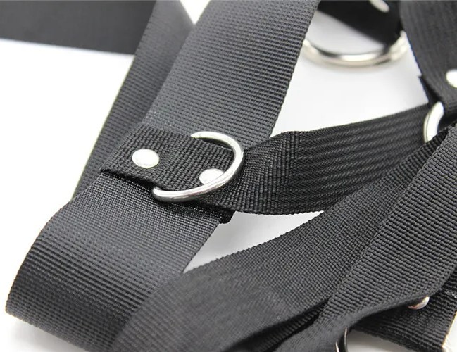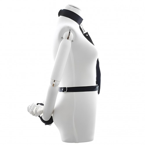Отличительная черта этой сбруи - по форме напоминает эротическое боди. Кроме того, есть поводок, а сзади руки фиксируются ремнями к телу, гарантируя полную обездвиженность партнера.