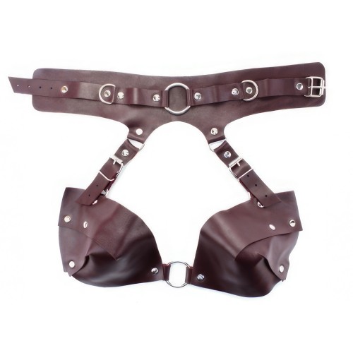 Высокий ошейник с металлическим кольцом спереди присоединяется к изысканному кожаному лифу. Сбруя фиксируется ремнями и пряжками, позволяющими подобрать нужный размер. Страстный аксессуар станет отличным дополнение к БДСМ игре.