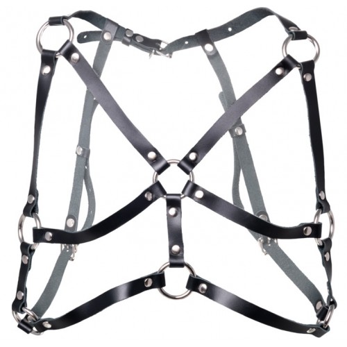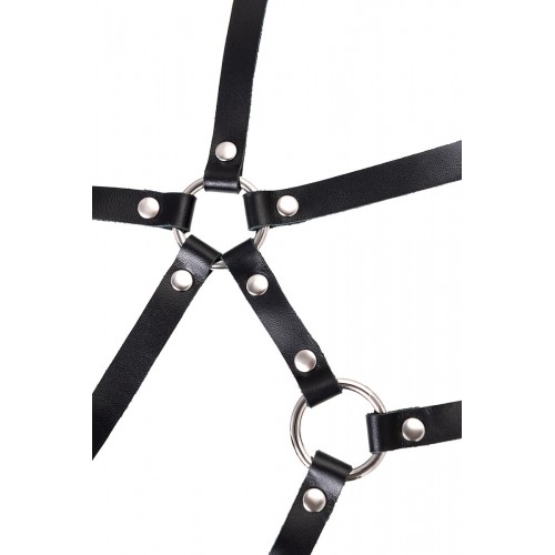 Портупея фиксируется сзади, в области бюста. Хорошая посадка по фигуре обеспечивается благодаря регулируемым ремешкам. Они выполнены из экологичной натуральной кожи.