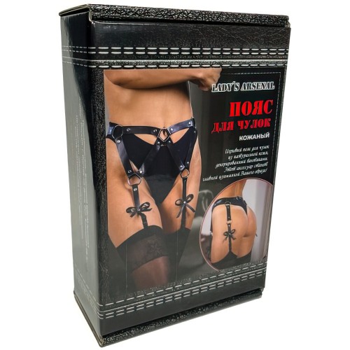 Утонченный и сексуальный кожаный пояс для чулок, выполнен в черном цвете, декорирован металлическими кольцами и бантиками, которые эффектно подчеркивают фигуру и создают эротичный, соблазнительный образ.