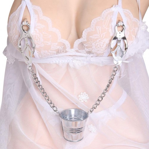 Ведерко, которое прикреплено цепями к зажимам, позволит расширить круг воплощаемых фантазий - Вы сможете положить в него дополнительные утяжелители, чтобы еще больше обострить ощущения.