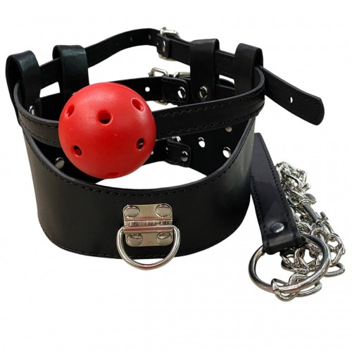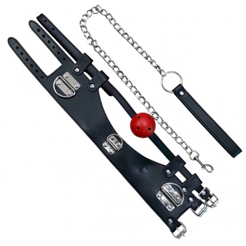 Размер: максимальная ширина ошейника 10 см, ошейник по обхвату регулируется от 36 до 43 см, диаметр кляпа 4 см, кляп по обхвату регулируется от 42 до 64 см, длина цепи поводка 63 см, петельки – 16 см.