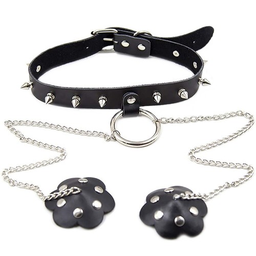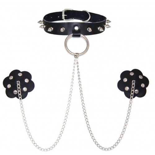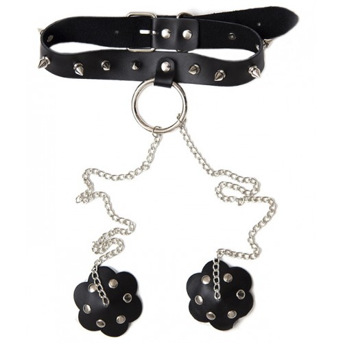 Ошейник украшен серебристыми металлическими шипами, так же от него отходят 2 цепочки, к которым крепятся пэстисы для сосков.