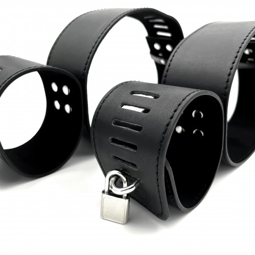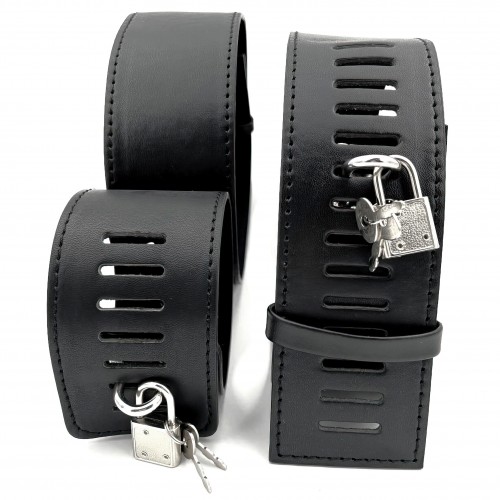 Размеры: обхват наручников от 19 см до 25 см, обхват поножей от 44 до 58 см, ширина манжетов 5,5 см.