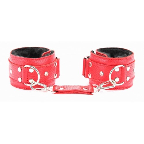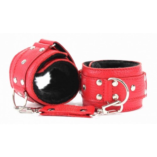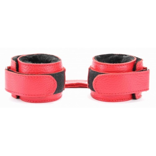 Легко, но надежно фиксируются ремнем на липучке, позволяя выбрать нужный размер.  Аксессуар декорирован заклепками. Кожаное соединение на карабинах фиксирует наручники вместе. Мягкий подклад из черного меха обеспечит комфортное прибывание в образе, помогая полностью погрузиться в БДСМ игру.