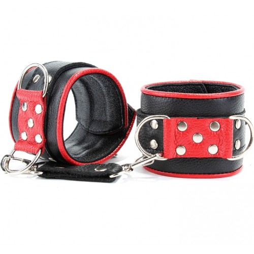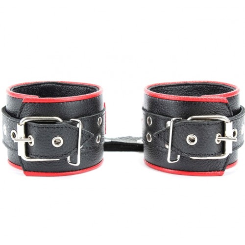 Стильные наручники на пряжке, выполненные из черной натуральной кожи с красной окантовкой.