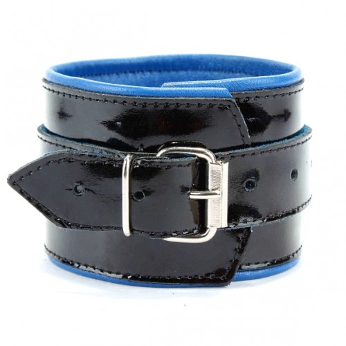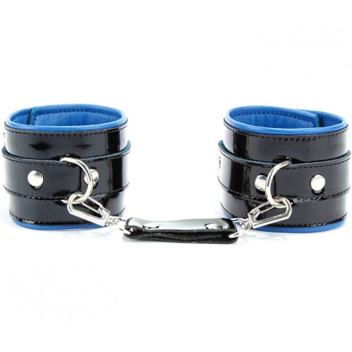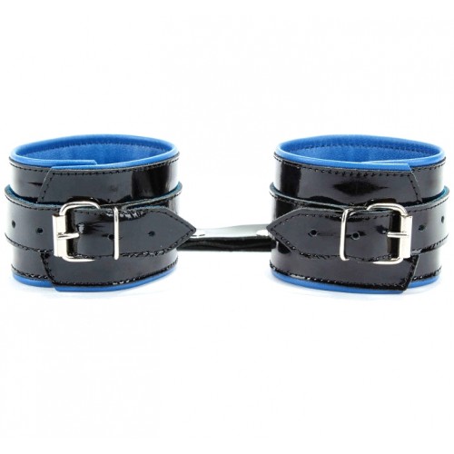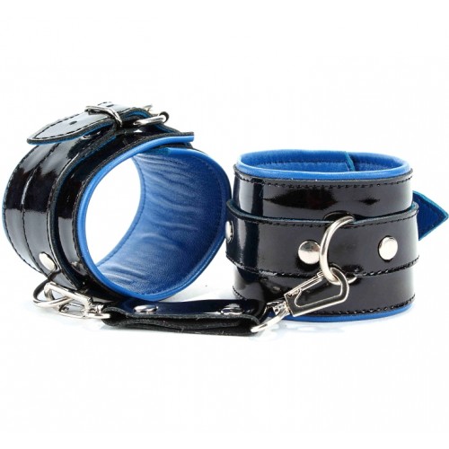 Шикарные наручники на пряжке, выполненные из натуральной лакированной кожи черного цвета с синим подкладом, выполненным из мягкой перчаточной кожи.