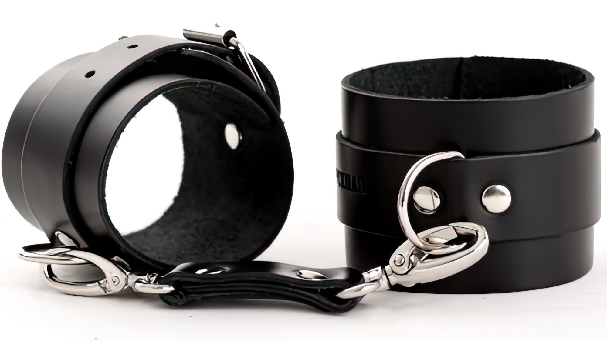 Металлическая фурнитура обеспечивает качественную фиксацию. Прочное кожаное соединение на мощных карабинах фиксирует наручники вместе.