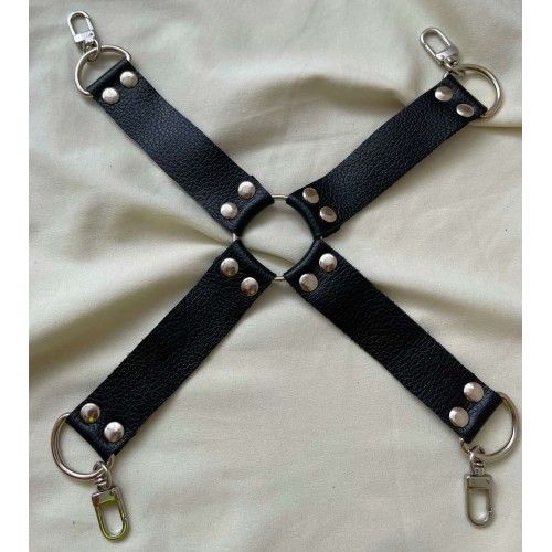 Изго­тов­лен бондажный крест из кожи, имеет четыре проч­ных креп­ле­ния с карабинами, к кото­рым Вы можете легко и быстро при­стег­нуть наруч­ники и понож­и.