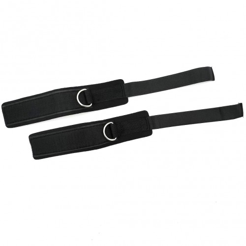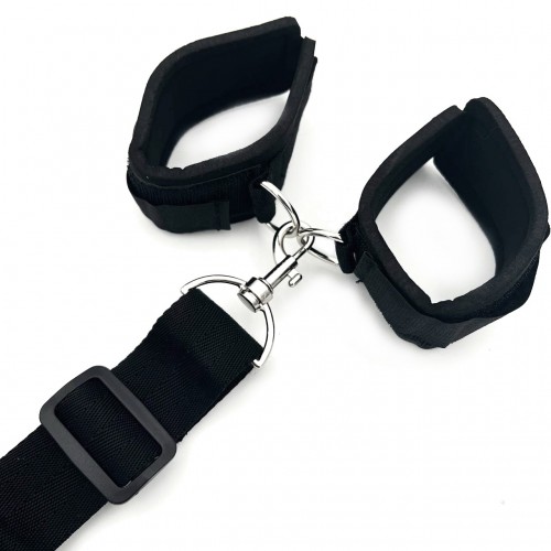 Наруч­ники крепятся за метал­ли­че­ские кара­бин­ы к ремню, идущему вдоль тела от ошей­ника до бедер.