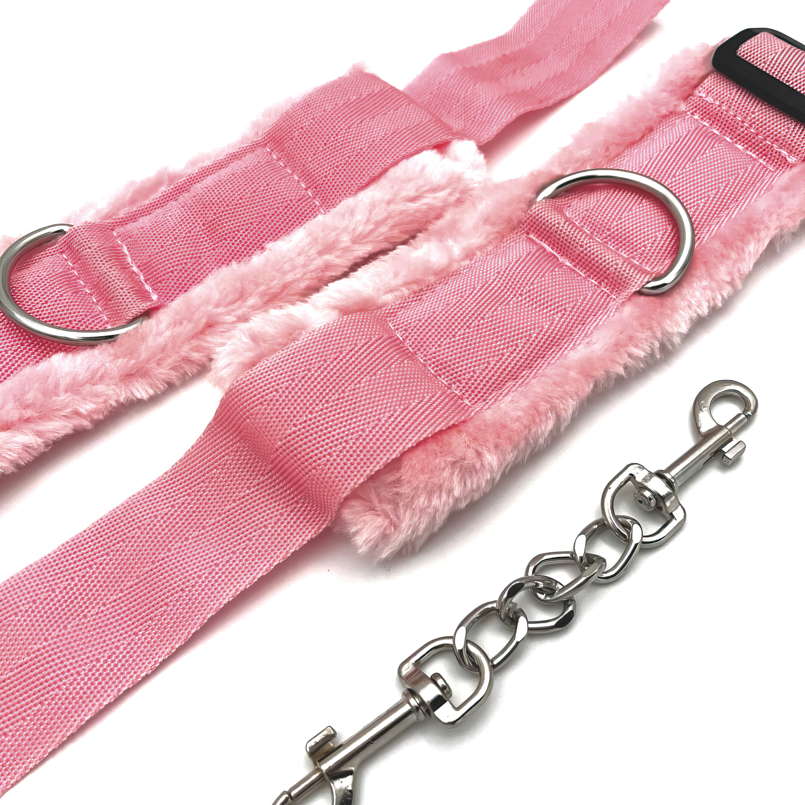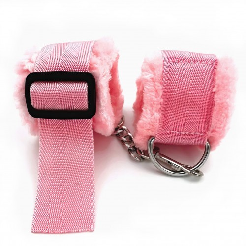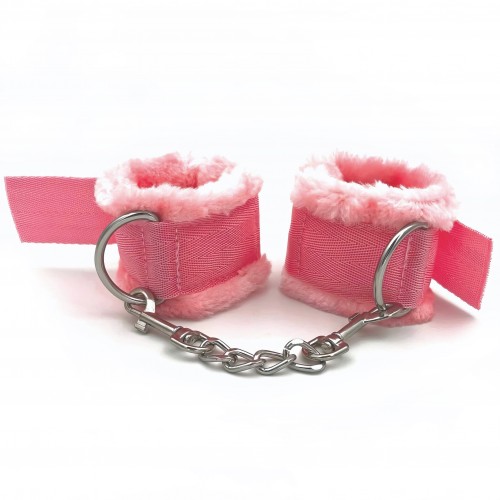 Наручники не при­чи­нят боли, так как их внутренняя сторона отделана мягким мехом. Соединяются между собой цепочкой с двумя карабинами на концах.