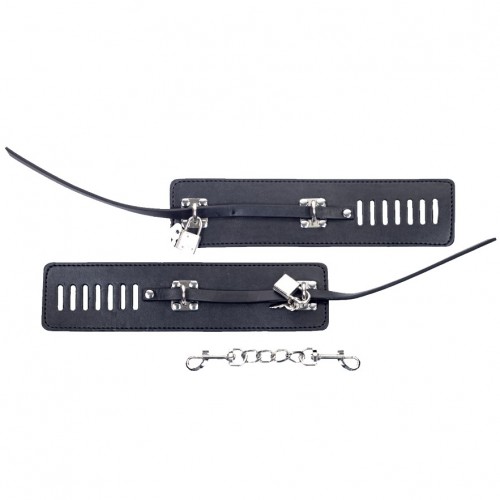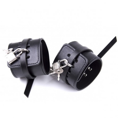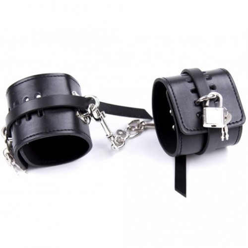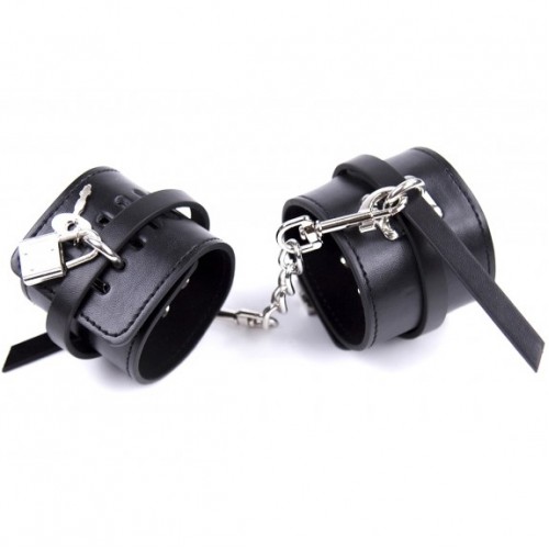 Наручники для БДСМ бондажа из искусственной кожи чёрного цвета имеют уни­вер­саль­ный размер, который удобно регу­ли­ру­ется при помощи застёжки на замке.