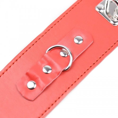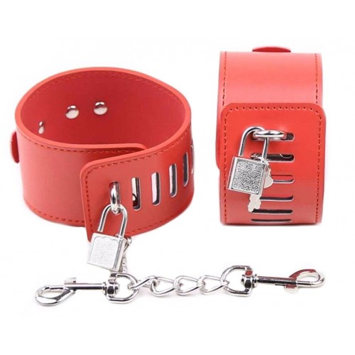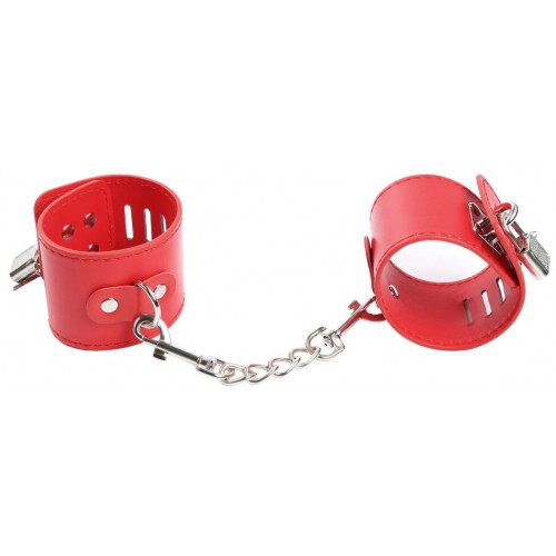 Наручники для БДСМ бондажа из искусственной кожи красного цвета имеют уни­вер­саль­ный размер, который удобно регу­ли­ру­ется при помощи застёжки на замке.