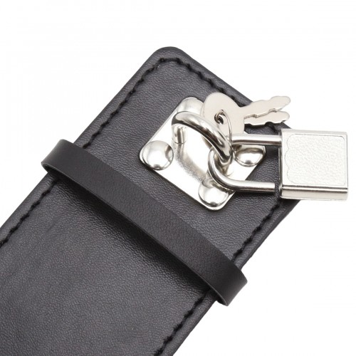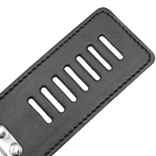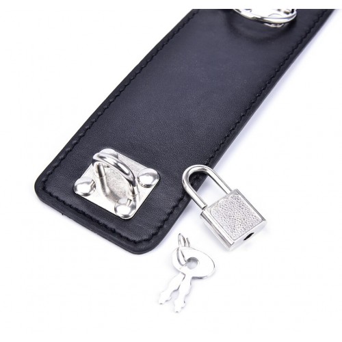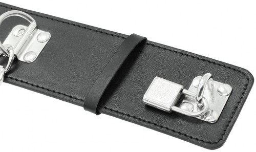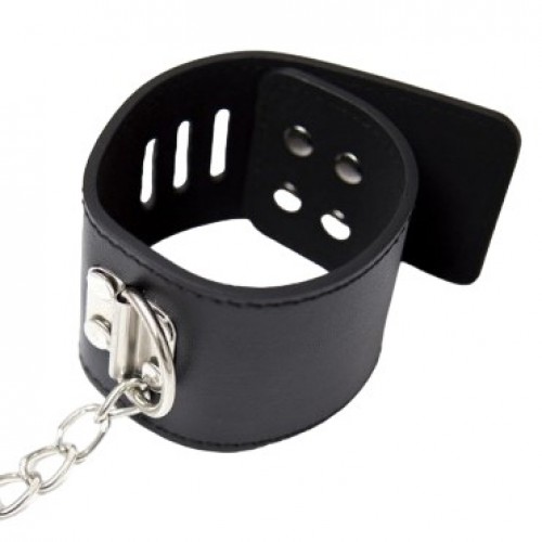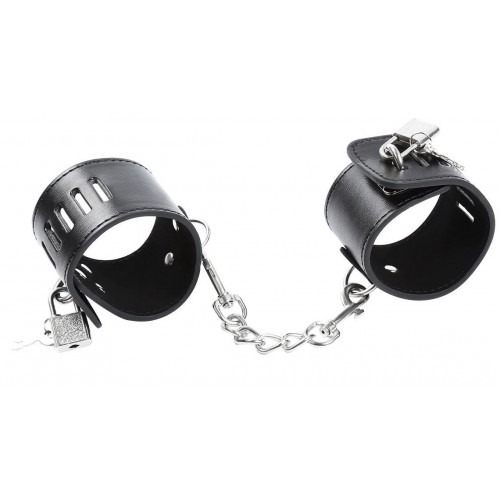 Наручники для БДСМ бондажа из искусственной кожи чёрного цвета имеют уни­вер­саль­ный размер, который удобно регу­ли­ру­ется при помощи застёжки на замке.