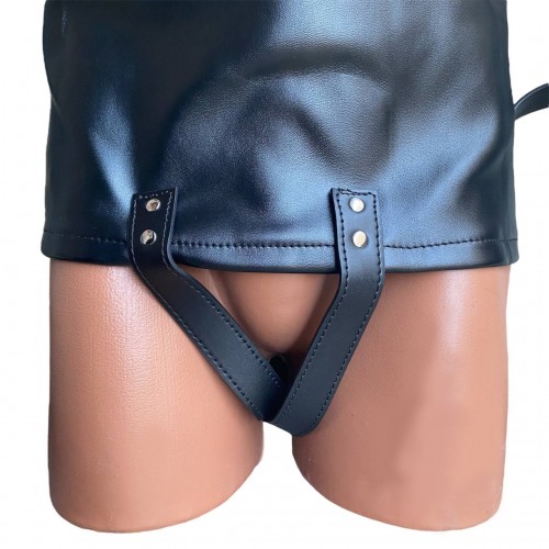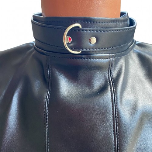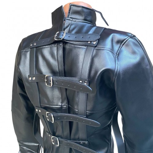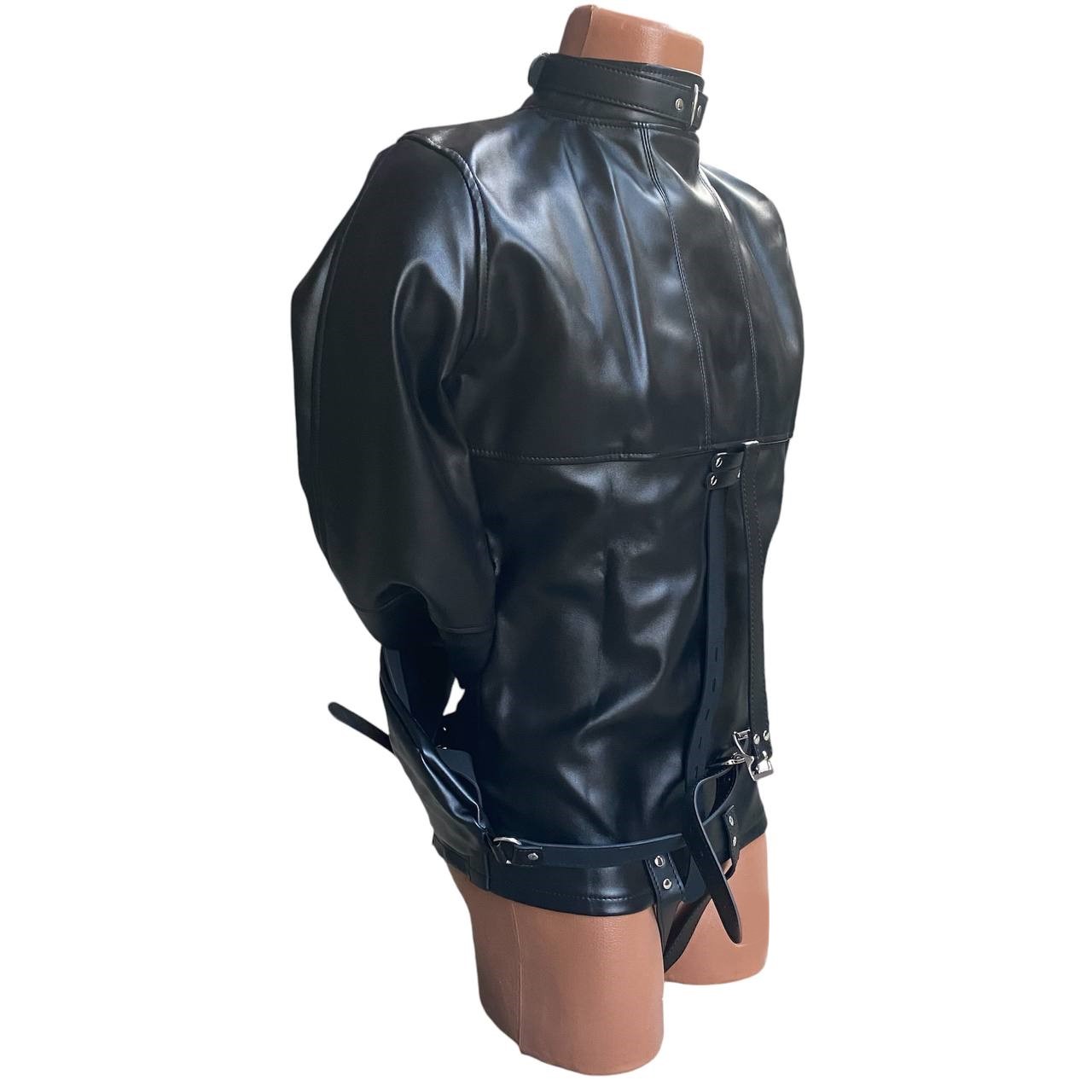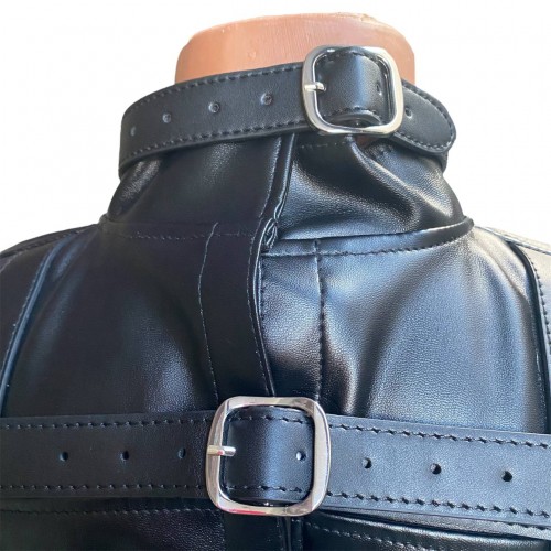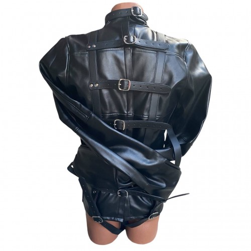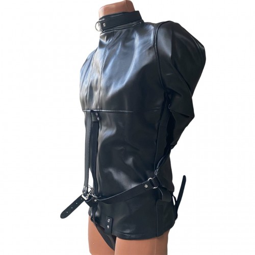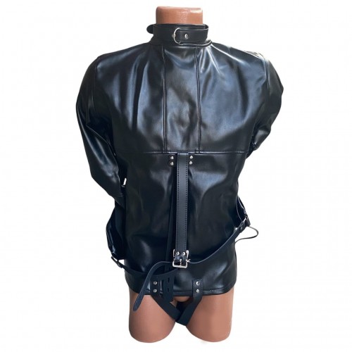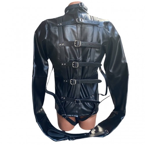 На рукавах без отверстий для кистей есть небольшие полукольца, которые можно соединить между собой ремнями. На ошейнике также есть полукольцо более крупного размера, к которым можно присоединить другие бондажные аксессуары, чтобы разнообразить сценарии игры. Размер жакета регулируется при помощи ремешков с пряжками.