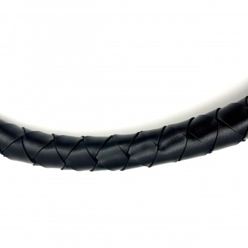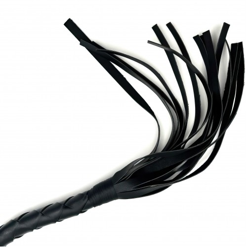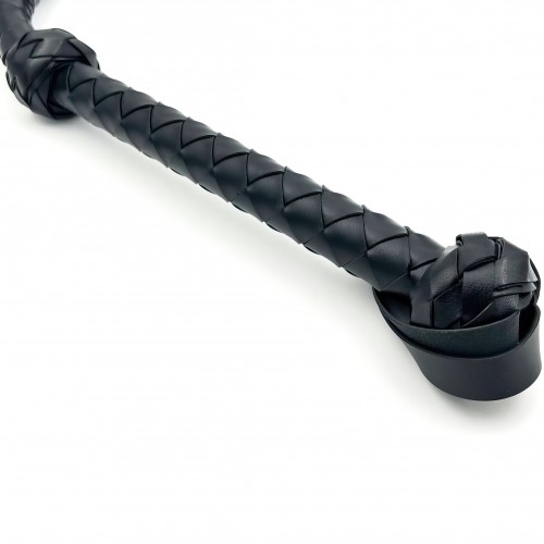 Кнут выполнен из искусственной кожи черного цвета с необычным плетением: он постепенно утончается к концу, на котором крепятся хлысты.
