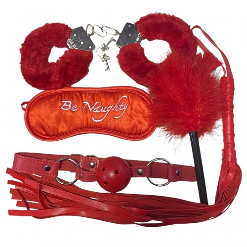 В набор входит: маска для глаз, плеть, тиклер, наручники и кляп.