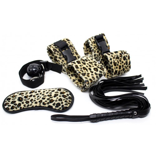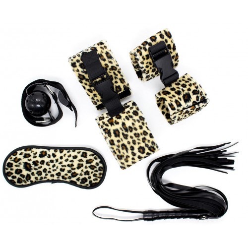В набор входят: наручники, поножи, плеть, маска для глаз и кляп.