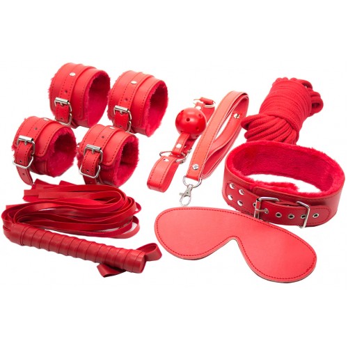 В набор входят: наручники, поножи, плеть, веревка, кляп, ошейник с поводком и маска для глаз.