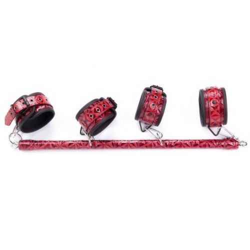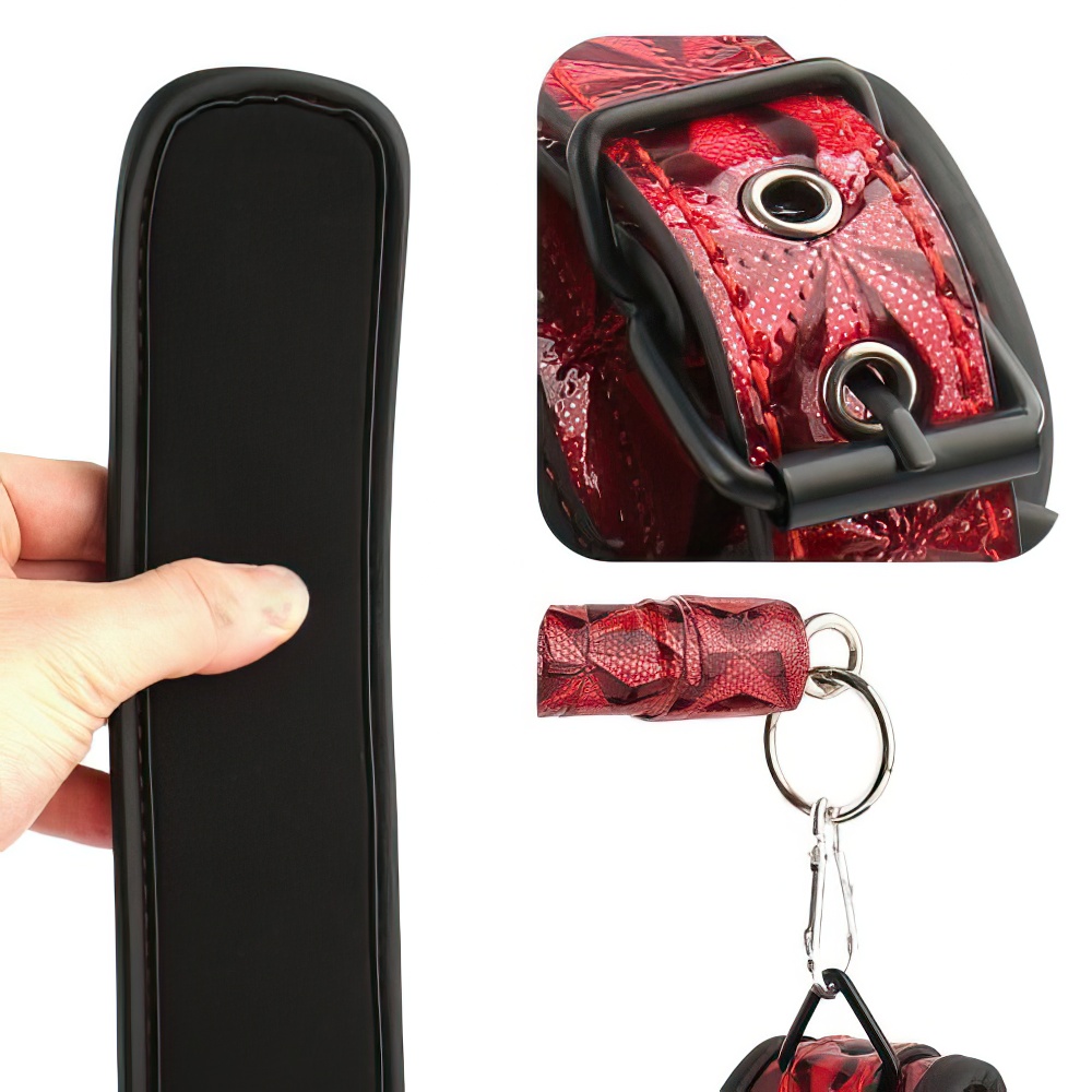 В набор входят: наручники, поножи, распорка, плеть, кляп и ошейник с поводком.