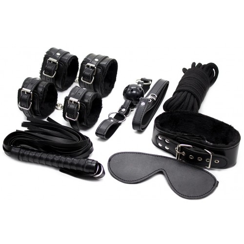 В набор входят: наручники, поножи, плеть, веревка, кляп, ошейник с поводком и маска для глаз.