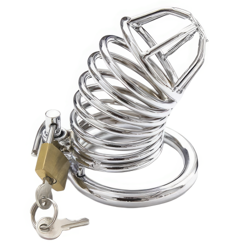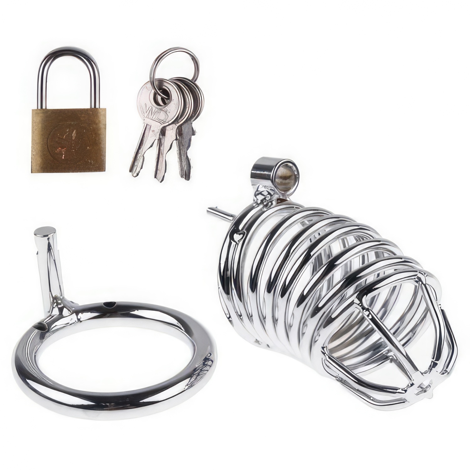 Комплектация: клетка для пениса, запорное кольцо, замок с двумя ключами, бархатный мешочек для хранения.