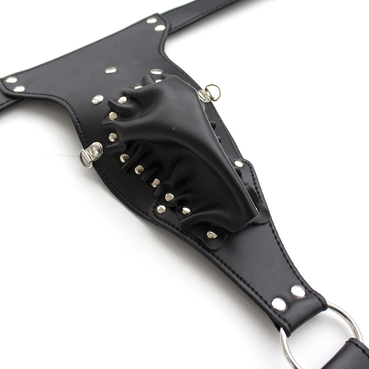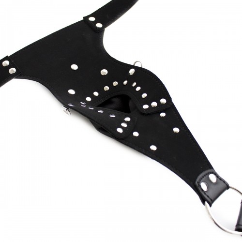 Аксессуар мужского целомудрия изготовлен из искусственной кожи и безопасного металла.