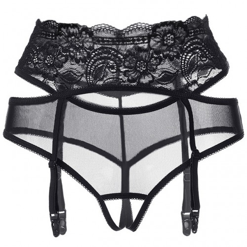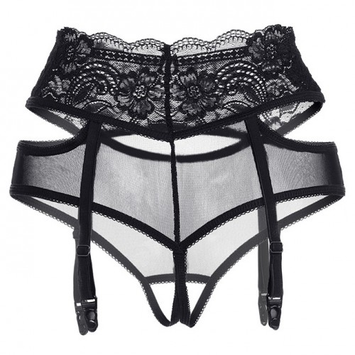 Эротические трусики-пояс для чулок Erolanta Marianne выполнены из эластичной сетки со вставками кружева, с декоративными вырезами.