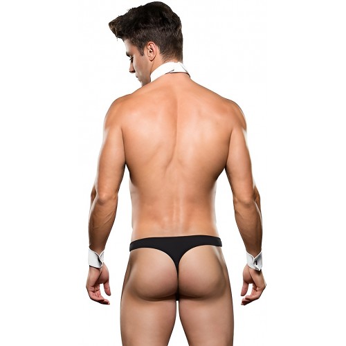 На самом деле... от рубашки остались только элегантный воротник и манжеты для запястий. А из штанов... сексуальные мужские стринги, демонстрирующие ягодицы в полной красе.