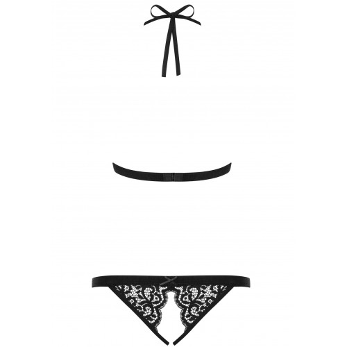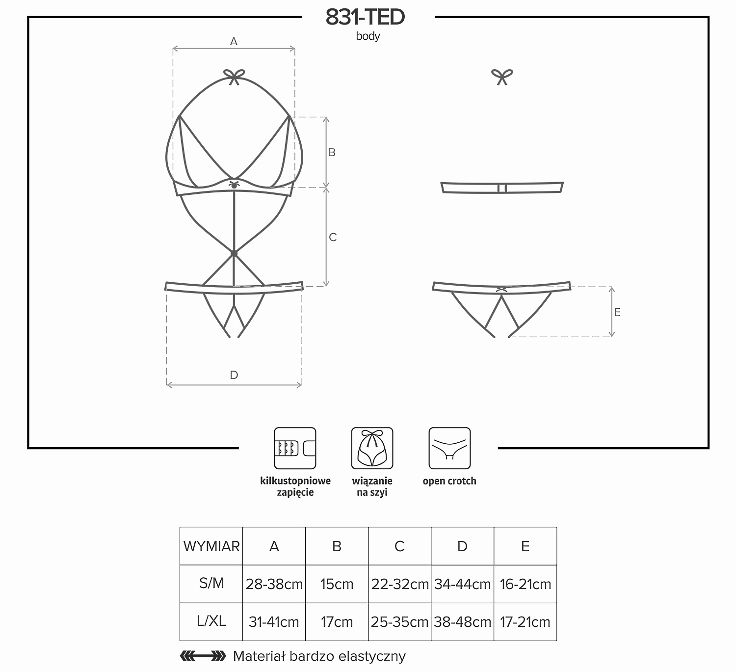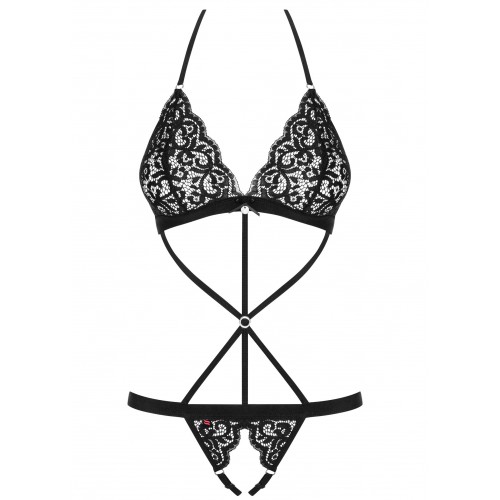 Детали: пикантное боди из черного кружева и эластичных лент, сочетание бюстгальтера и трусиков, сексуальная шнуровка на шее (открытая спина!), многоступенчатая застежка - идеальная посадка, открытая промежность, украшения в виде блестящих круглых элементов и бантов, эластичная ткань, адаптирующаяся к телу.