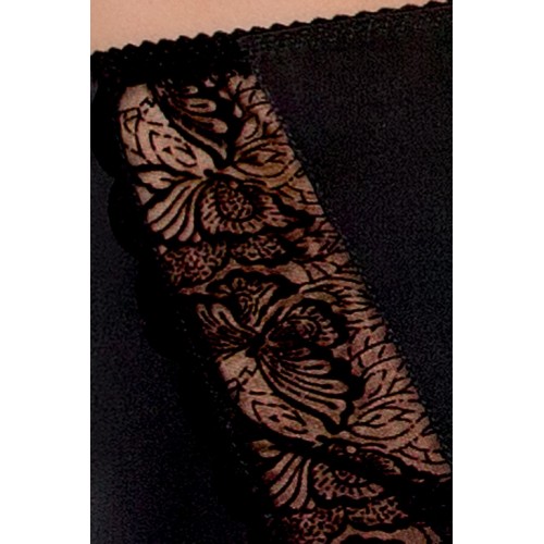 Комплект выполнен из испанской черной микрофибры и элегантного цветочного кружева украшает бюстгальтер и широкий пояс для чулок, придавая вашему образу загадочности.