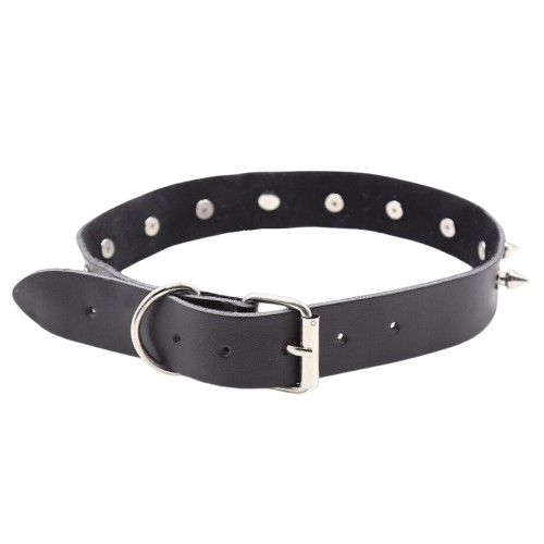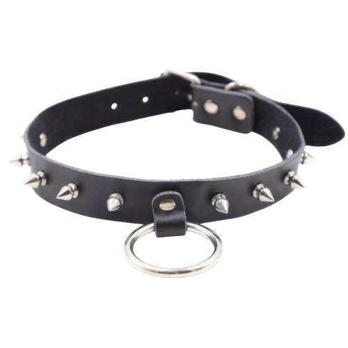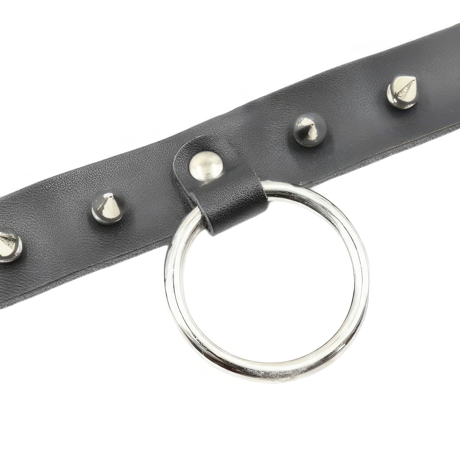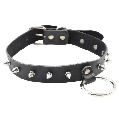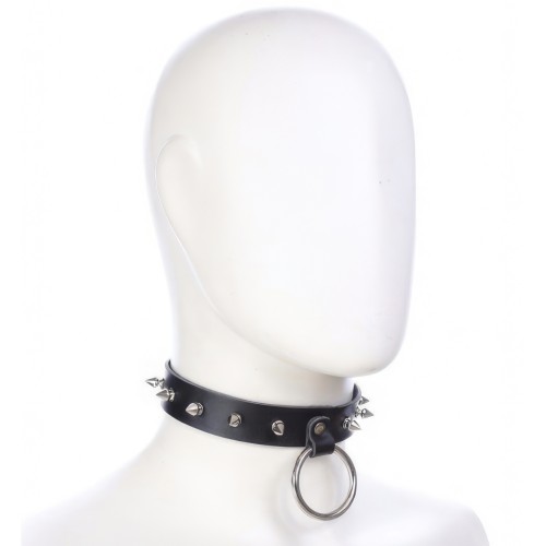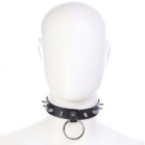 Кожаный черный БДСМ ошейник с кольцом и шипами