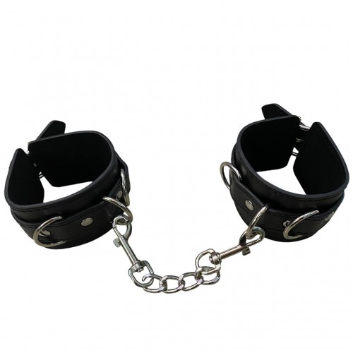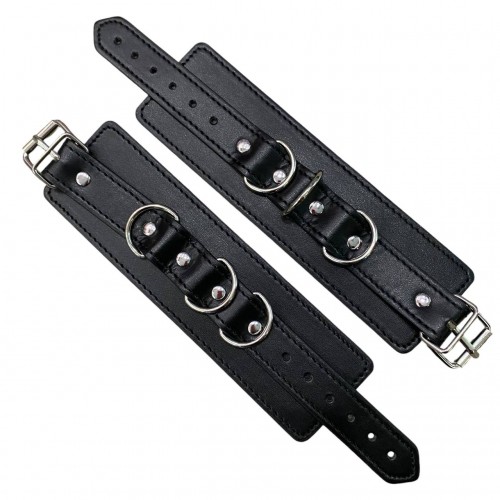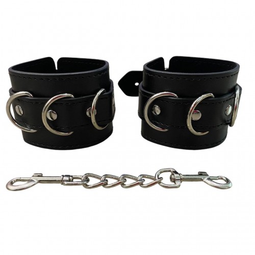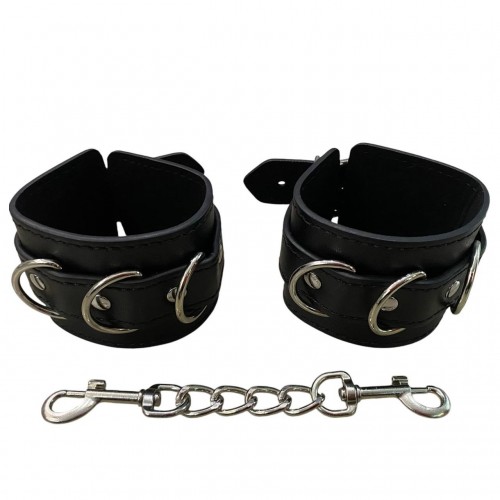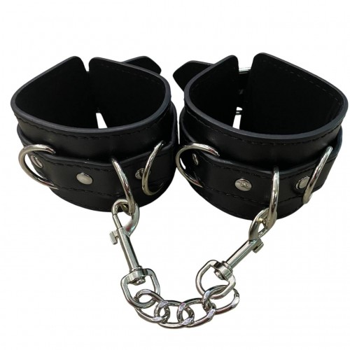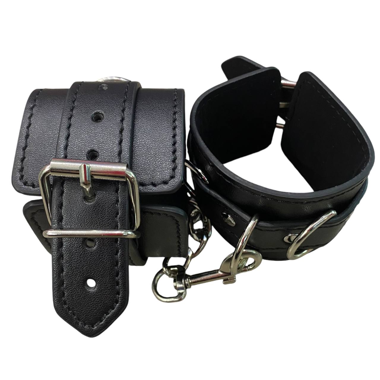 Металлическая фурнитура обеспечивает качественную фиксацию. Наручники соединяются между собой цепью с карабинами, благодаря чему обеспечивается достаточно жесткая сцепка.
