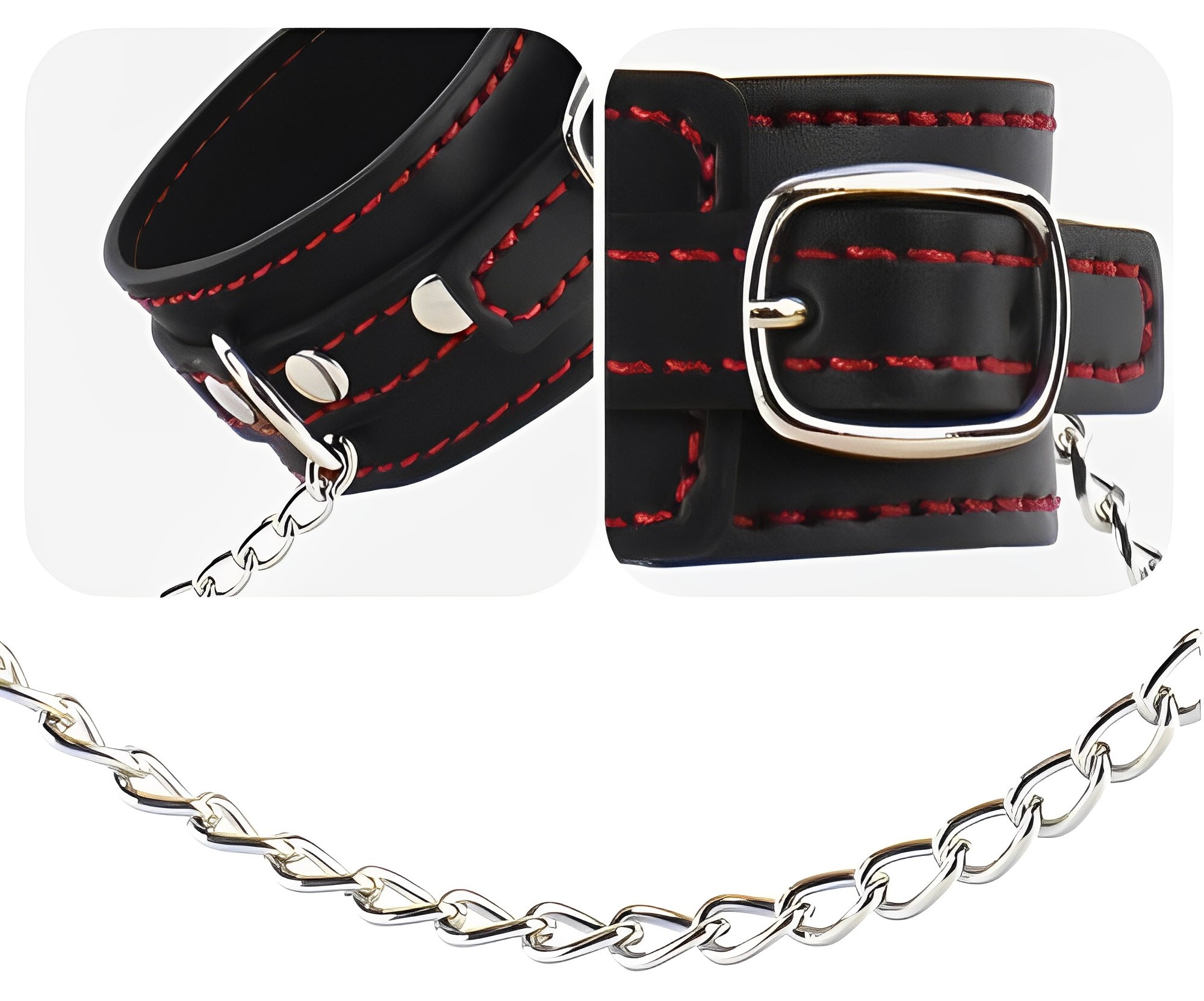 Соединяются наручники цепочкой без карабинов, ее длина 16,5 см - это позволит заковывать фиксаторы вокруг мебели или других предметов.