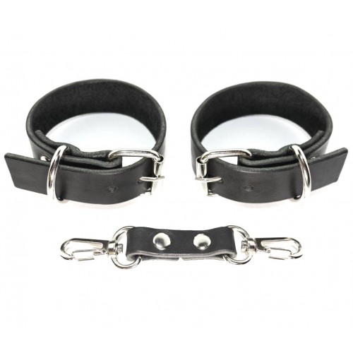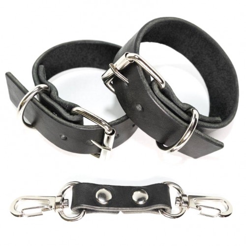 Наручники надежно фиксируются пряжками и ремнями, позволяющими выбрать нужный размер, кожаное соединение на карабинах фиксирует наручники вместе. Стильные наручники отлично подходят для воплощения эротических БДСМ игр.