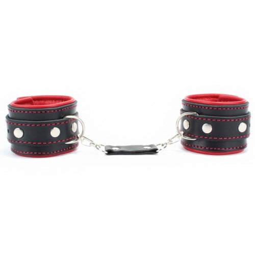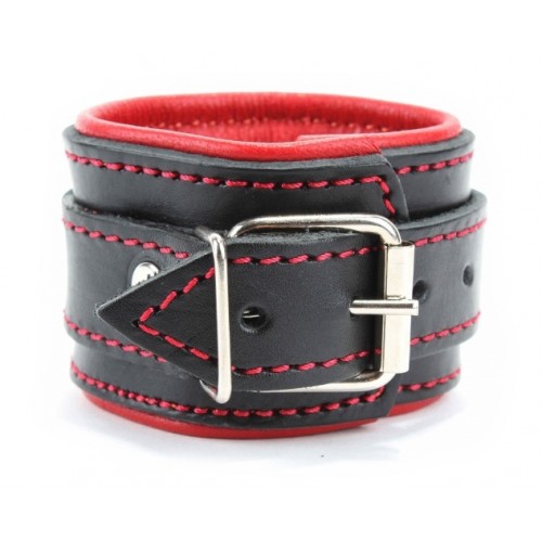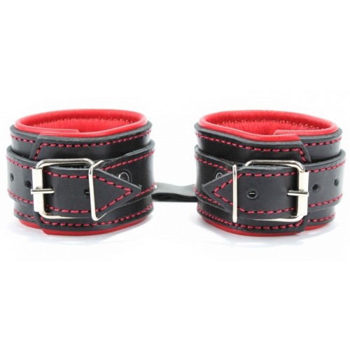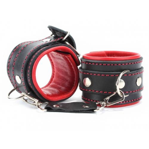 Оковы выполнены из толстой ременной кожи с подкладном из ярко красной перчаточной кожи. Аксессуар декорирован красной строчкой.