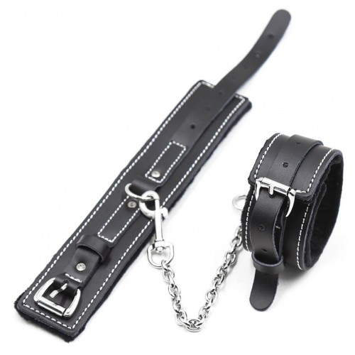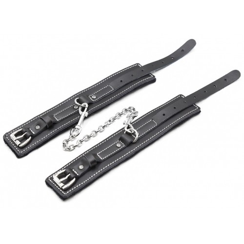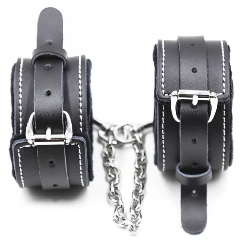 Металлическая фурнитура обеспечивает качественную фиксацию. Наручники соединяются между собой цепью с карабинами, благодаря чему обеспечивается достаточно жесткая сцепка.