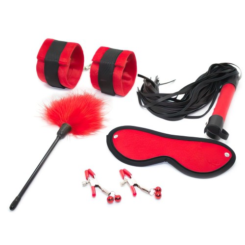 В набор входят: наручники, плеть, зажимы на соски, тиклер и маска для глаз.
