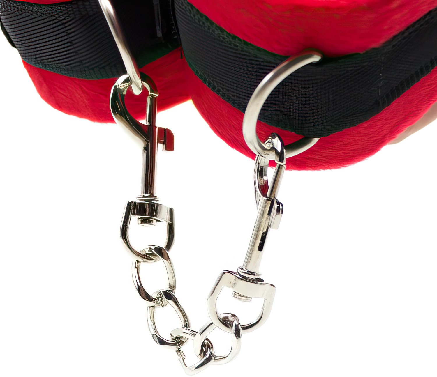 - наручники: общая длина 34 см (по обхвату регулируются за счет липучки), ширина 5 см, длина цепочки с карабинами 15 см