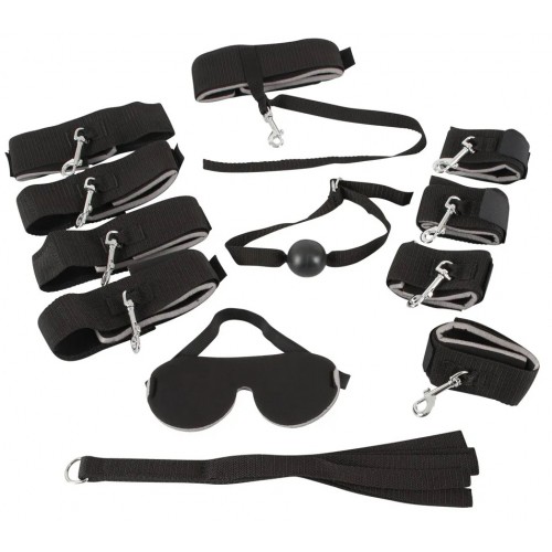 В комплект входят: Доска для бондажа , 4 мягких манжеты для запястий, 4 мягкие манжеты для лодыжек, ошейник, кляп, плеть, маска на глаза.
