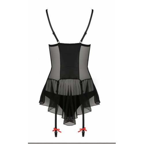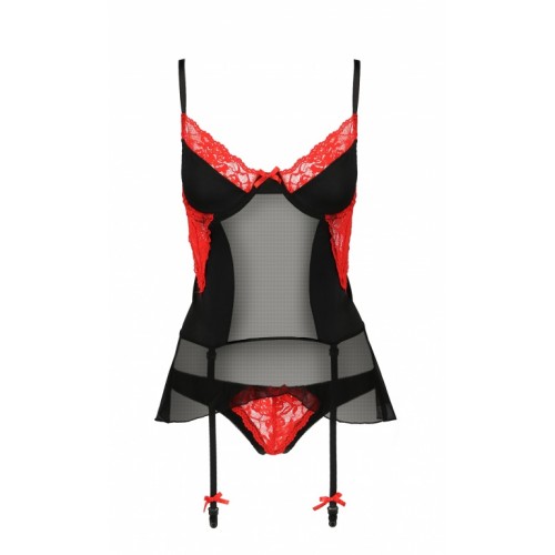 Очаровательный корсет Odina черного цвета с подвязками для чулок, выполнен из эластичной ткани, полупрозрачного тюля и кружева красного цвета.