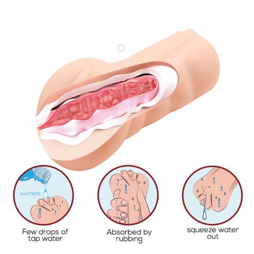 Особенность игрушки заключается в том, что при добавлении нескольких капель воды в тоннель мастурбатора, материал принимает консистенцию скользящей, увлажняющей смазки.