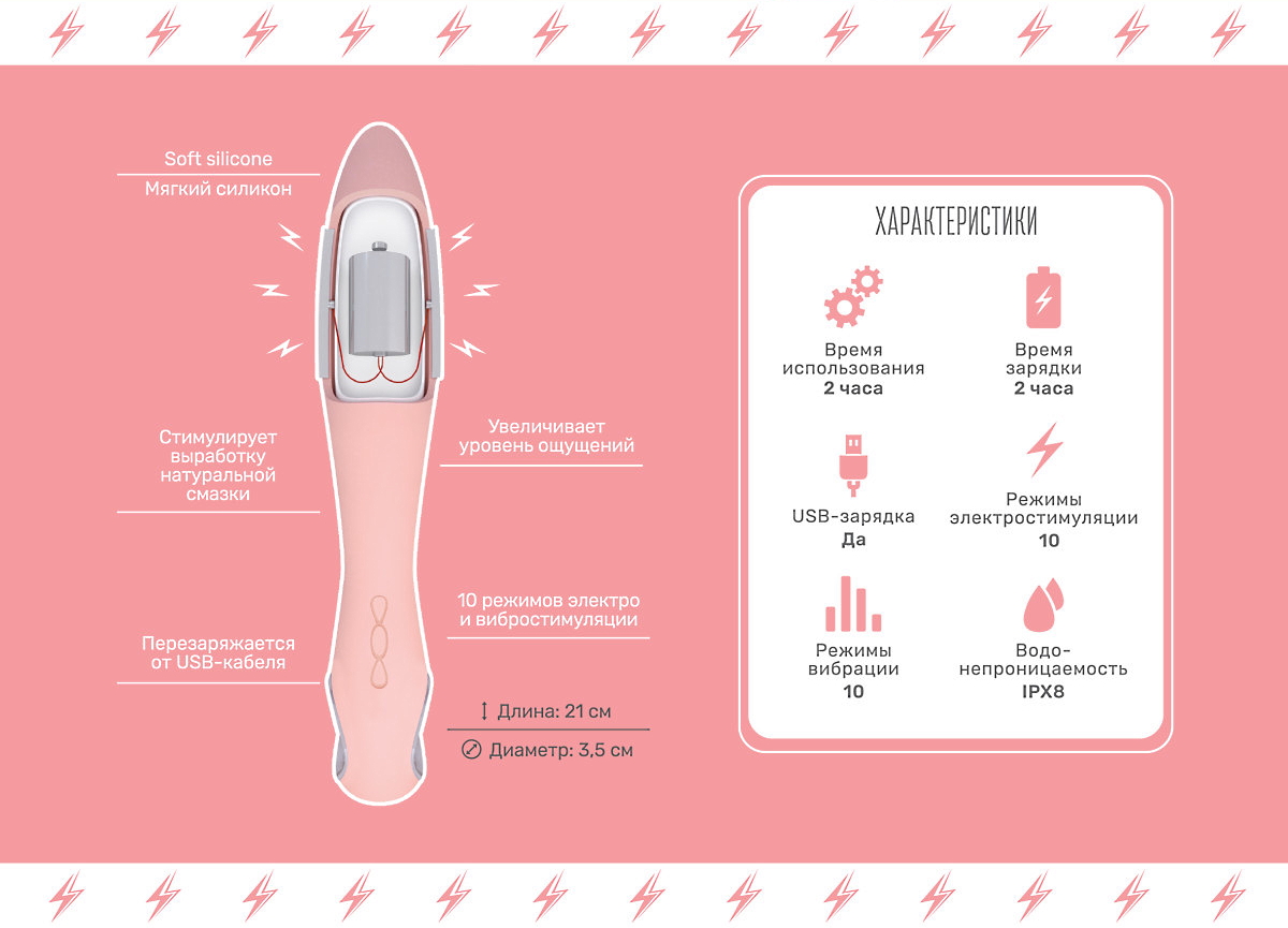 Игрушка оснащена 10 функциями вибрации и 10 режимами электростимуляции.