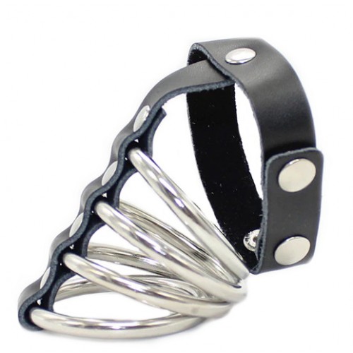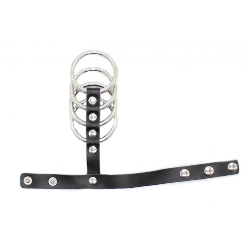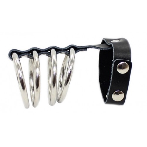 Ремешок из натуральной кожи фиксируется у основания пениса или под мошонку, четыре металлических кольца надеваются на ствол пениса.