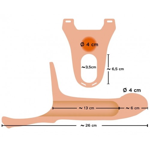 Ствол фаллоса имеет выраженную головку и выпуклую головку для дополнительной стимуляции, фаллопротез удобно крепится к телу при помощи плотных ремней, размер регулируется.
