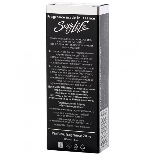 Духи с феромонами Sexy Life – безспиртовые (на масляной основе) ароматические композиции, в состав которых добавлены феромоны - уникальное средство для привлечения внимания противоположного пола и усиления любовного влечения.